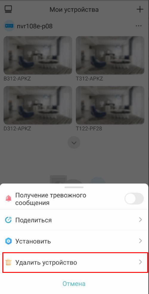 Для отключения устройства от облака p2p через мобильное приложение авторизуйтесь в облачной учётной записи и перейдите во вкладку Устройства> выберите устройство и нажмите Удалить.